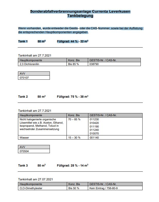 2021-08-14-KSTA-Greenpeace nimmt weitere Proben Zu ungenau sei außerdem die von Currenta veröffentlichte Liste der verbrannten Stoffe. Viola Wohlgemuth fordert mehr Transparenz: „Entweder, die wissen wirklich nicht, was genau in den Tanks war, oder sie verkaufen uns alle für dumm.“ Currenta hatte Inhalte von Tanks genannt, aber nur im Groben. Klar beurteilte das Grünen-Gründungsmitglied, der promovierte Chemiker Rainer Welte die von Currenta veröffentlichten Tabellen der Tank-Inhalte: Die dort aufgeführten Stoffe seien Chemikalien, die viel Geld kosteten, sagte er, aber sie seien ja mit weiteren Chemikalien verunreinigt, sonst müsse man sie nicht verbrennen.