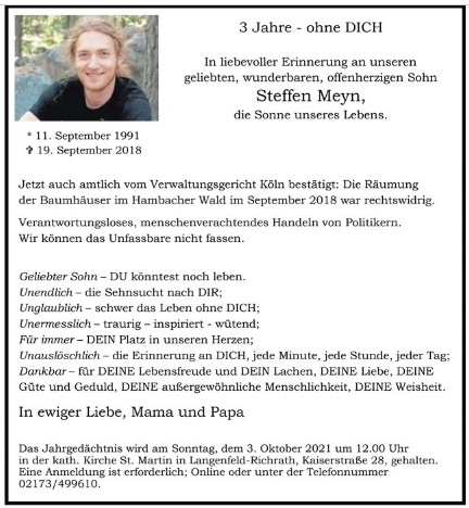 2021-09-23-KSTA-Das Urteil macht Steffens Tod noch sinnloserKLIMAPROTESTE - Steffen Meyn starb bei der Räumung des Hambacher Forstes (Waldes), die das Verwaltungsgericht Köln nachträglich für rechtswidrig erklärte – Seine Mutter erhebt schwere Vorwürfe gegen das Land