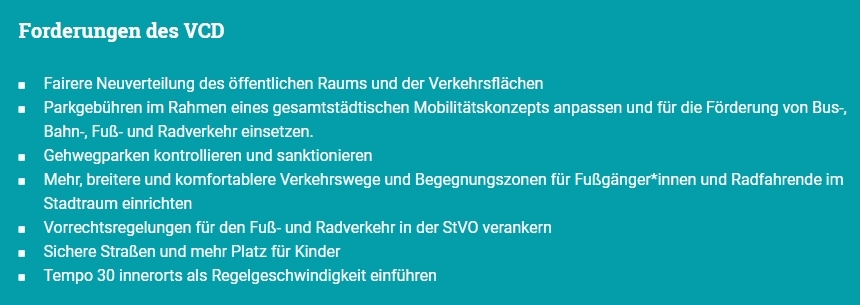 Selbst in Städten, in denen weniger Wege mit dem Auto zurückgelegt werden, gehört ihm die Straße. Hinzu kommt, dass private Pkw oft umsonst oder günstig im öffentlichen Raum abgestellt werden können und sehr viel Platz in Anspruch nehmen. Doch diesen immer knapper werdenden Raum brauchen wir dringend für die Nutzung durch die Allgemeinheit. Die Straßenverkehrsordnung (StVO) folgt immer noch dem Paradigma, dass der (Auto-)Verkehr fließen muss – zu Fuß Gehende und Radfahrende werden dadurch an den Rand gedrängt. Besser wären multimodal gestaltete Flächen – also Stadträume, die für Fuß, Rad, Bus und Bahn mitgestaltet sind statt nur fürs Auto. Auf solchen Flächen können mehr Menschen mobil sein als auf herkömmlichen, monomodalen Straßen, die für große Pkw optimiert sind, in denen im Schnitt nur 1,5 Personen sitzen. Für unsere Städte brauchen wir daher weniger Flächen, auf denen Autos einfach nur herumstehen, sondern mehr Platz für zu Fußgehende, Radfahrende und den öffentlichen Nahverkehr.